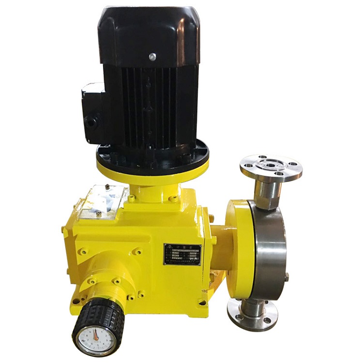 机械隔膜计量泵在原理上属于容积变化泵。是由电机通过涡轮蜗杆驱动柔性隔膜来回往复运动,从而改变泵腔容积,以达到连续排吸液体目的计量泵型号,使用隔膜把液体与驱动润滑机构之间隔离开来,并且隔膜为静密封,无动密封。其流量可按各种工艺流程的需要,在0-100%范围内无级调节,定量输送不含固体颗粒的腐蚀性和非腐蚀性液体。相比较于其它驱动方式的计量泵来说,其容积效率较低,出口压力小(般在1.0MPa以内),流量适用范围小,计量精度比柱塞计量泵和液压隔膜计量泵低,当压力从小到大时,流量变化可达-10%。