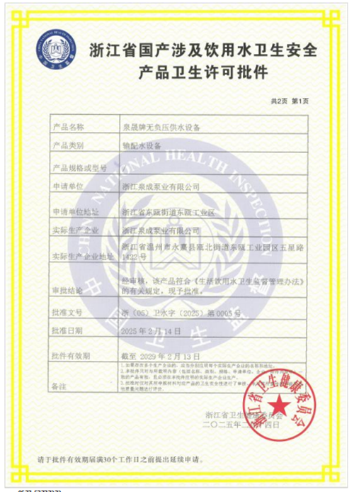 多级离心泵卫生许可批件