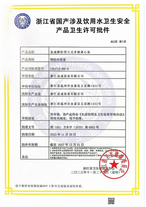 多级离心泵卫生许可批件